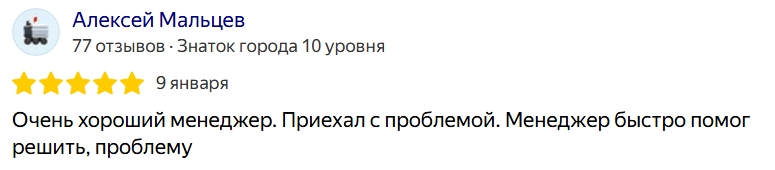 Очень хороший менеджер. Приехал с проблемой. Менеджер быстро помог решить, проблему