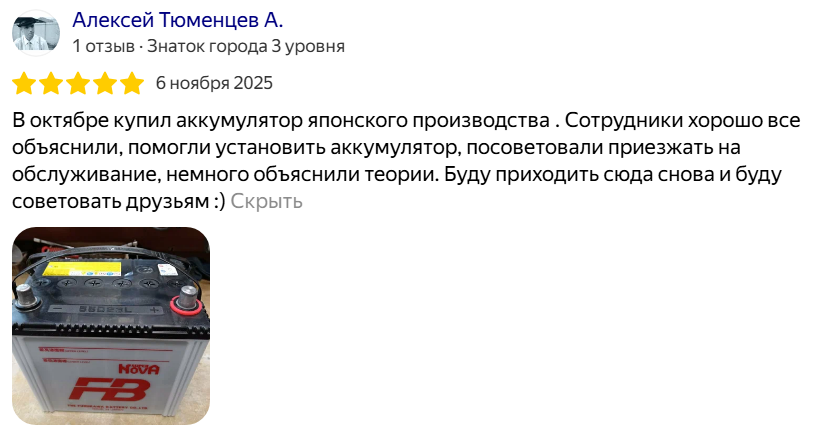 В октябре купил аккумулятор японского производства . Сотрудники хорошо все объяснили, помогли установить аккумулятор, посоветовали приезжать на обслуживание, немного объяснили теории. Буду приходить сюда снова и буду советовать друзьям :)