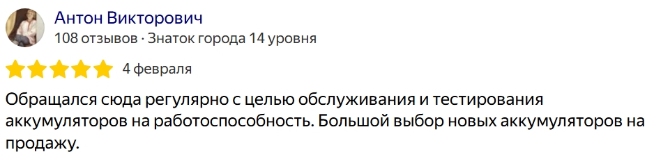 Обращался сюда регулярно с целью обслуживания и тестирования аккумуляторов на работоспособность. Большой выбор новых аккумуляторов на продажу.