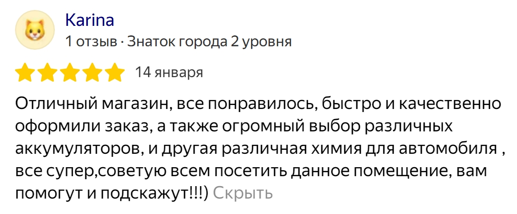 Отличный магазин, все понравилось, быстро и качественно оформили заказ, а также огромный выбор различных аккумуляторов, и другая различная химия для автомобиля , все супер,советую всем посетить данное помещение, вам помогут и подскажут!!!)
